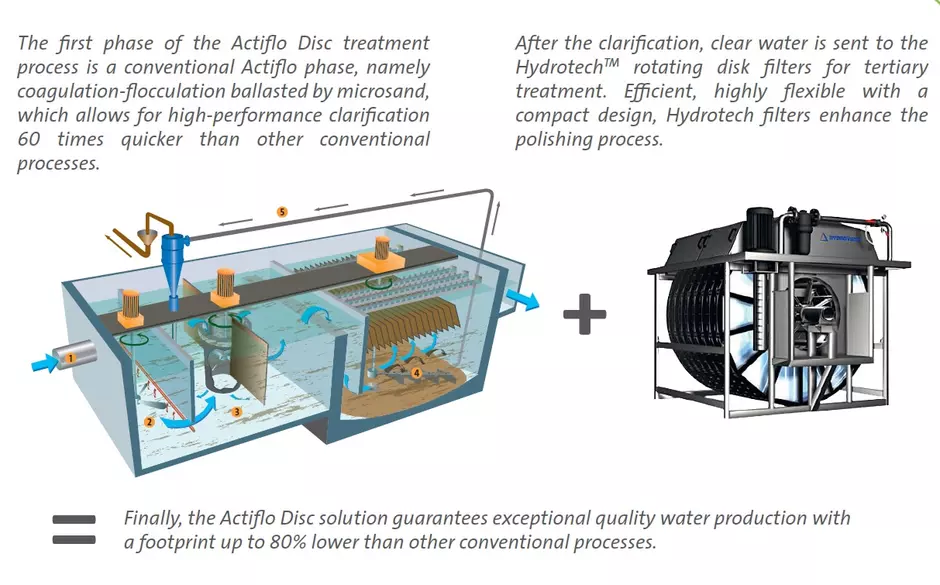 Actiflo® Disc’s configuration combines two efficient and compact treatment processes: a conventional Actiflo® phase, namely coagulation-flocculation ballasted bu microsand which allows for high-performance clarification, followed by a rotating disk filter polishing system for tertiary treatment.