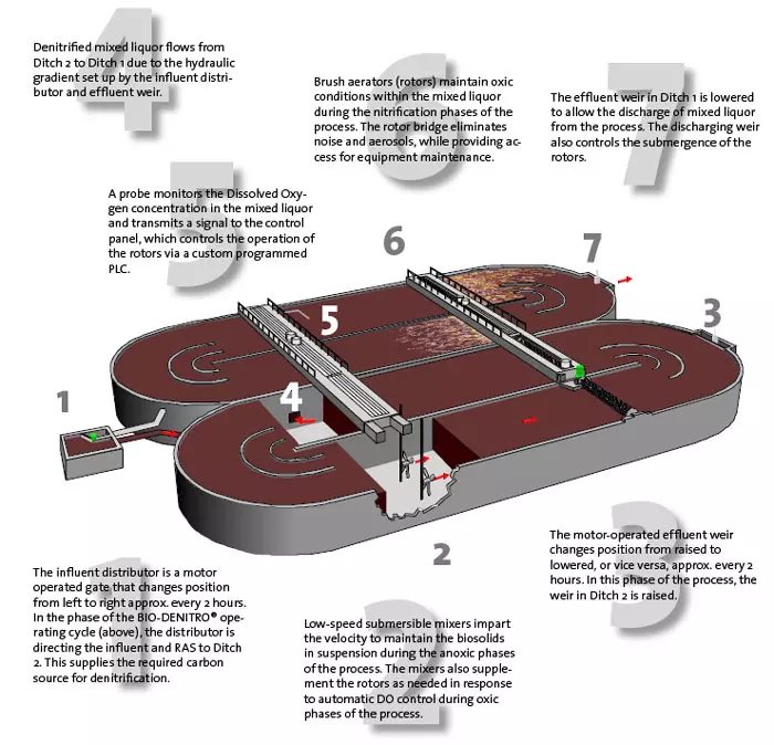 The oxidation ditch system consists of an anaerobic tank located before two interconnected biological tanks of equal volumes and a final settling tank. The biological tanks work in an alternating mode of operation and are equipped with aerators, inlet distributors and outlet chambers.