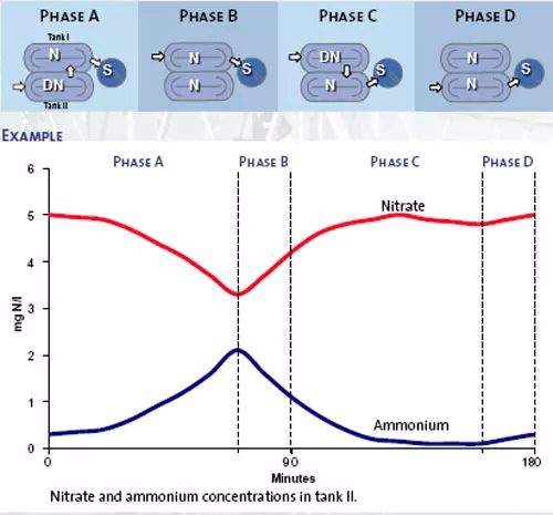 The Bio-denitro™ process can best be illustrated by following the nitrogen removal in one of the process tanks over a full operating cycle from phase A through D.