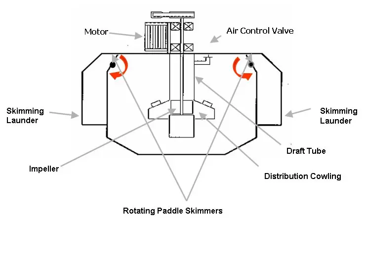 A rotating shaft and turbine impeller create a vortex which draws the gas down the draft tube entraining it in the water and forcing the bubble-rich water throughout the cell to aid contaminant rising. Side-mounted rotating mechanisms with adjustable paddles skim the contaminants off the surface into oily waste compartments.